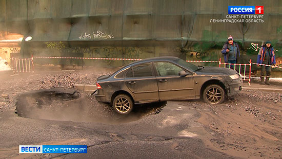 На набережной Фонтанки машина провалилась под асфальт из-за прорыва трубопровода