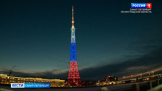 Петербургскую телебашню украсили праздничной подсветкой в честь 63-й годовщины начала телевещания